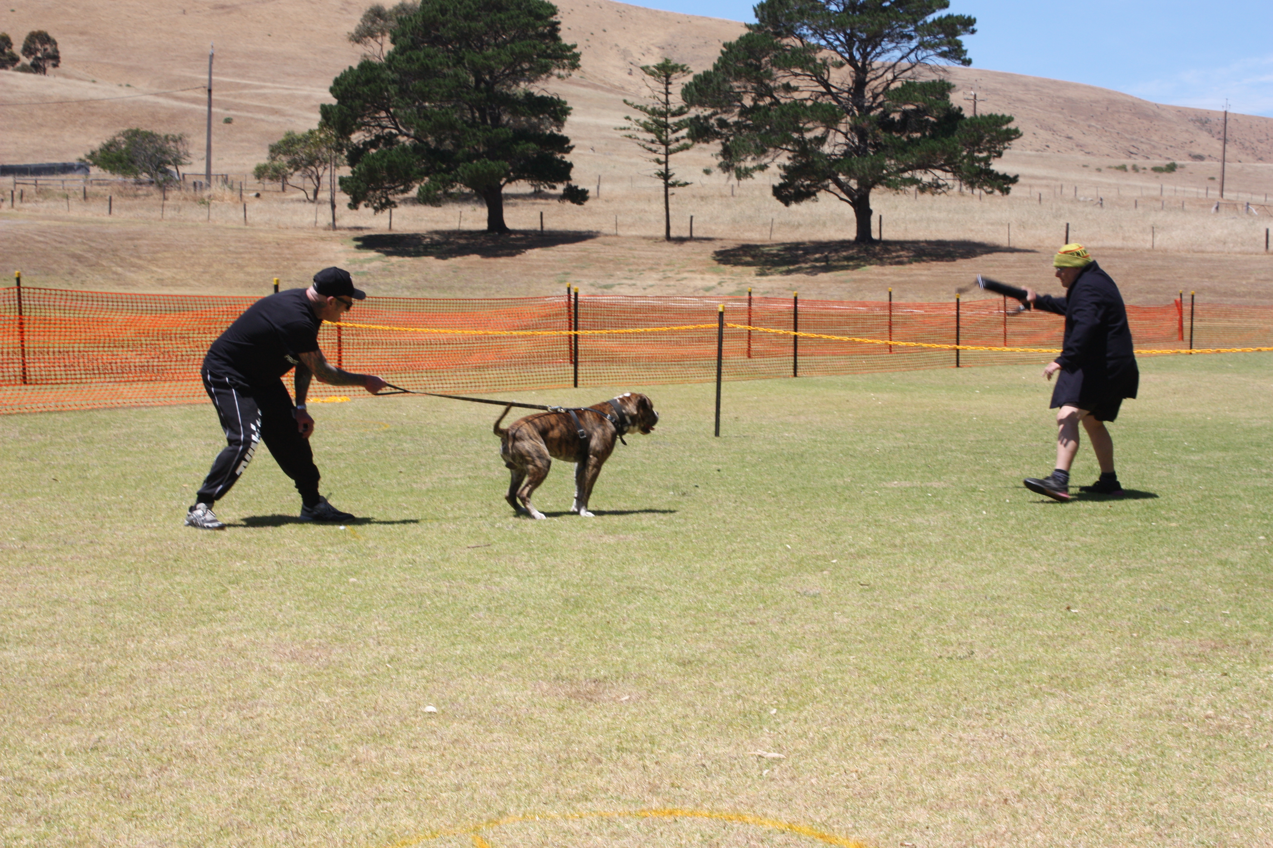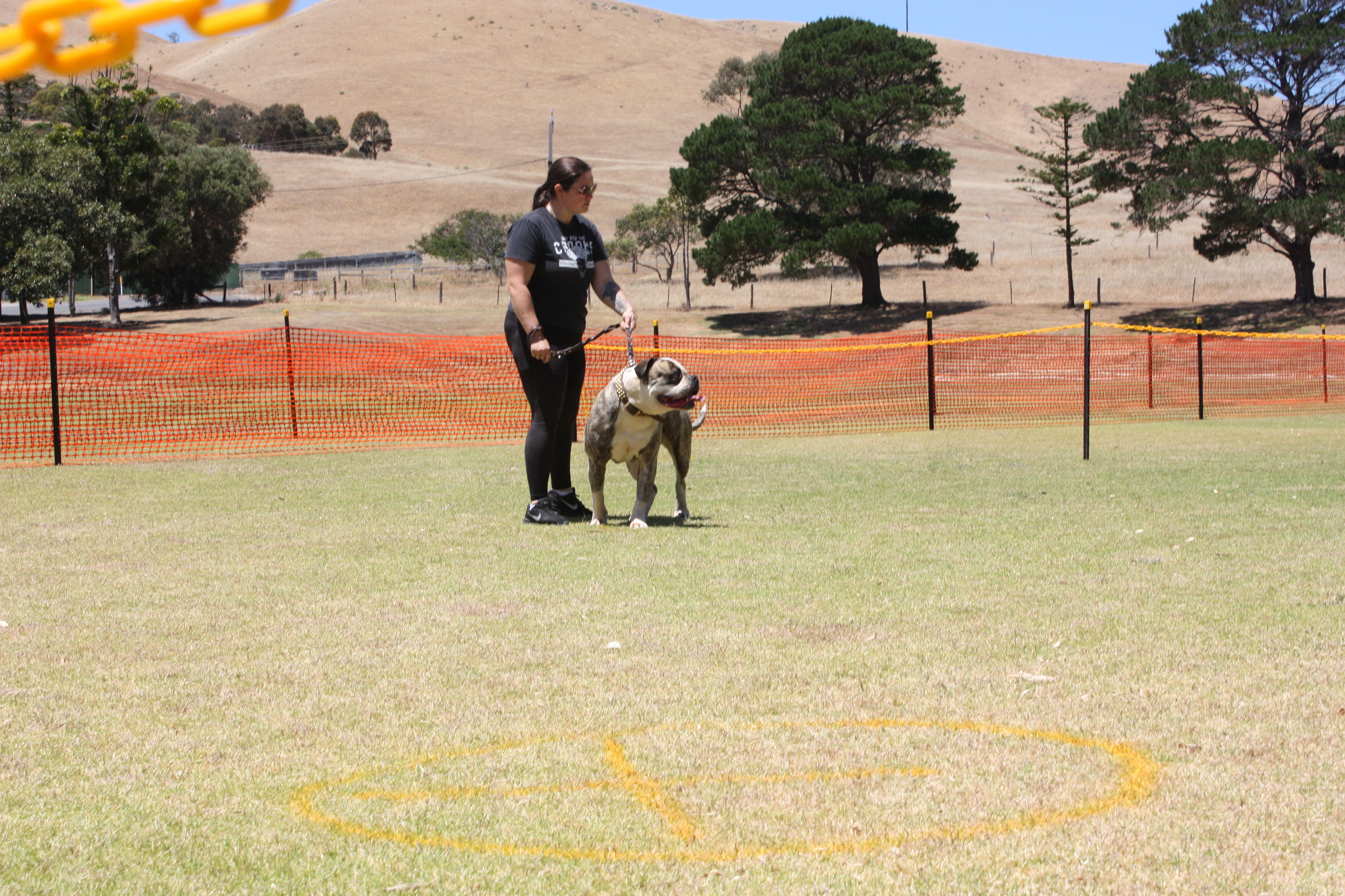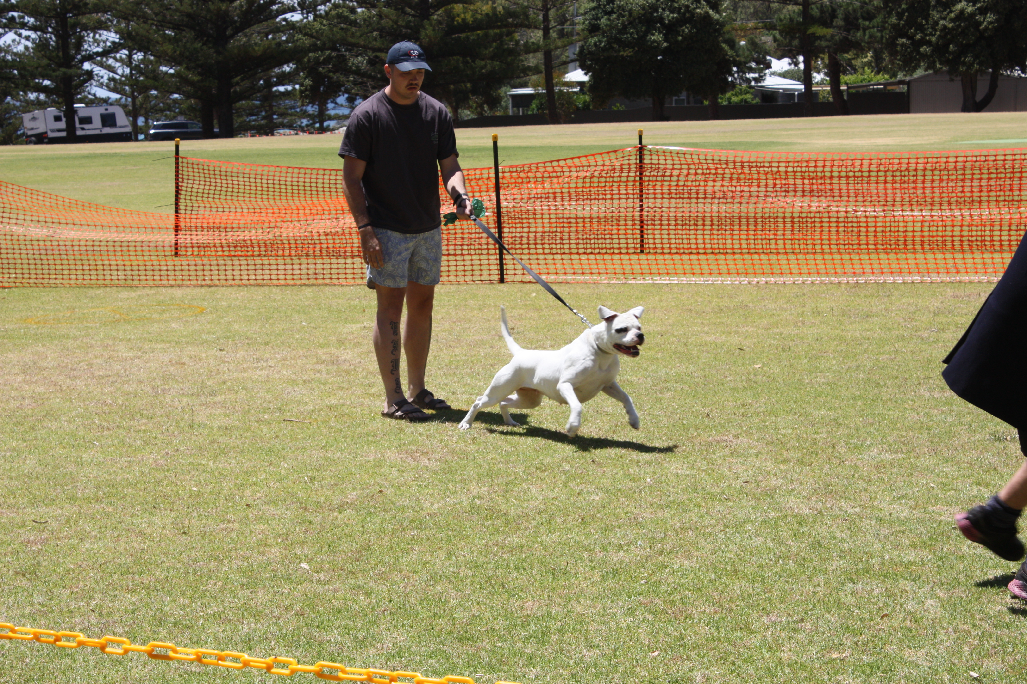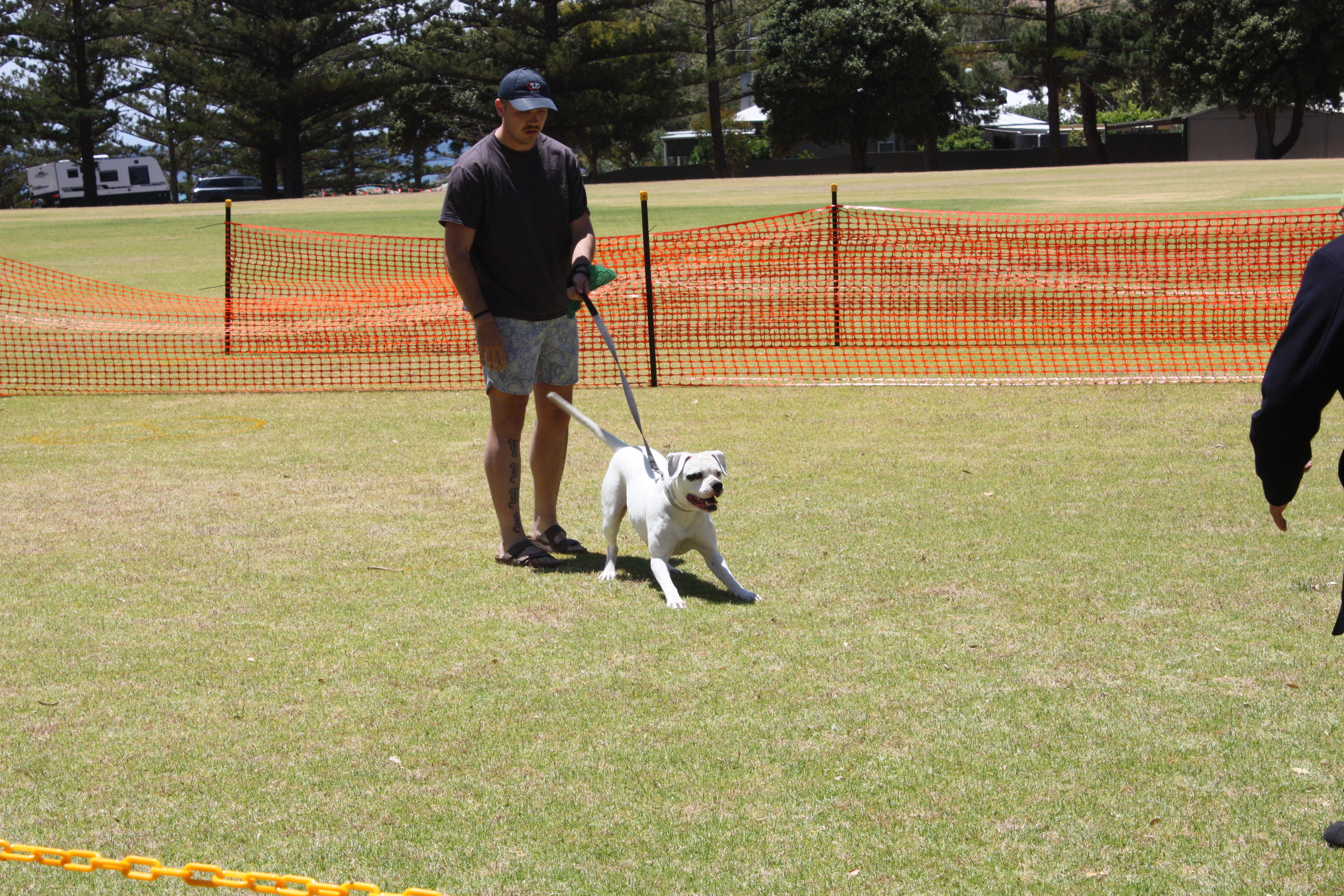 One by one the competitors roll up and find their shady spot at the picturesque show grounds overlooking the beach. The local caravan park is dog friendly and great value, only minutes away from the show grounds. People have travelled from Queensland and Victoria for the Show as it gets bigger year by year. Six major Bulldog kennels were represented at the show including Excalibur from Tasmania with Fury @ Badlands. Around 45 people attended on the day. Nine Bulldogs competed across the 5 events, Courage Test, Sprint, Obedience, Exhibition, Long Run. We ran the Champion and Junior Champion Competitions and awarded The Bulldog Legends Trophy.