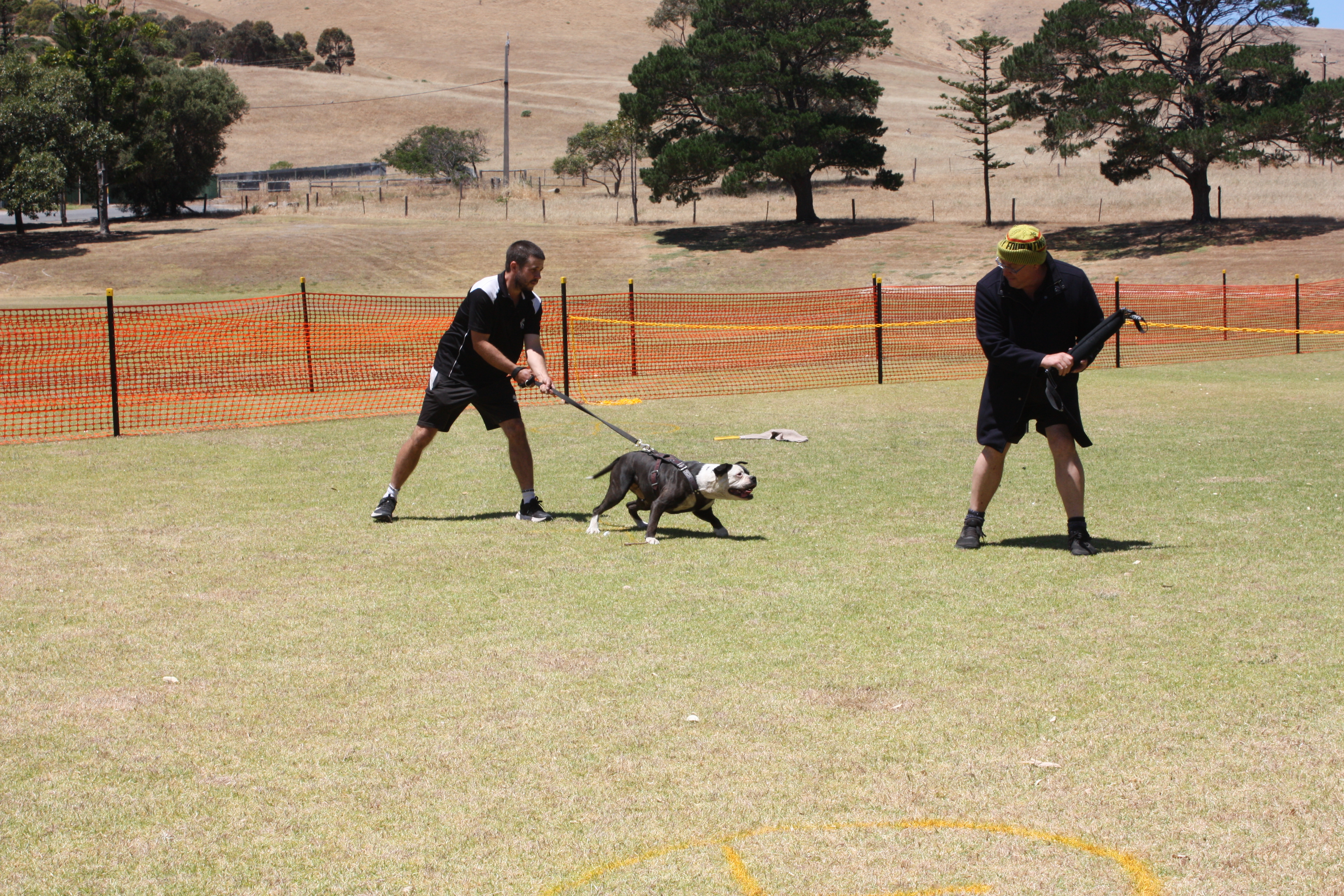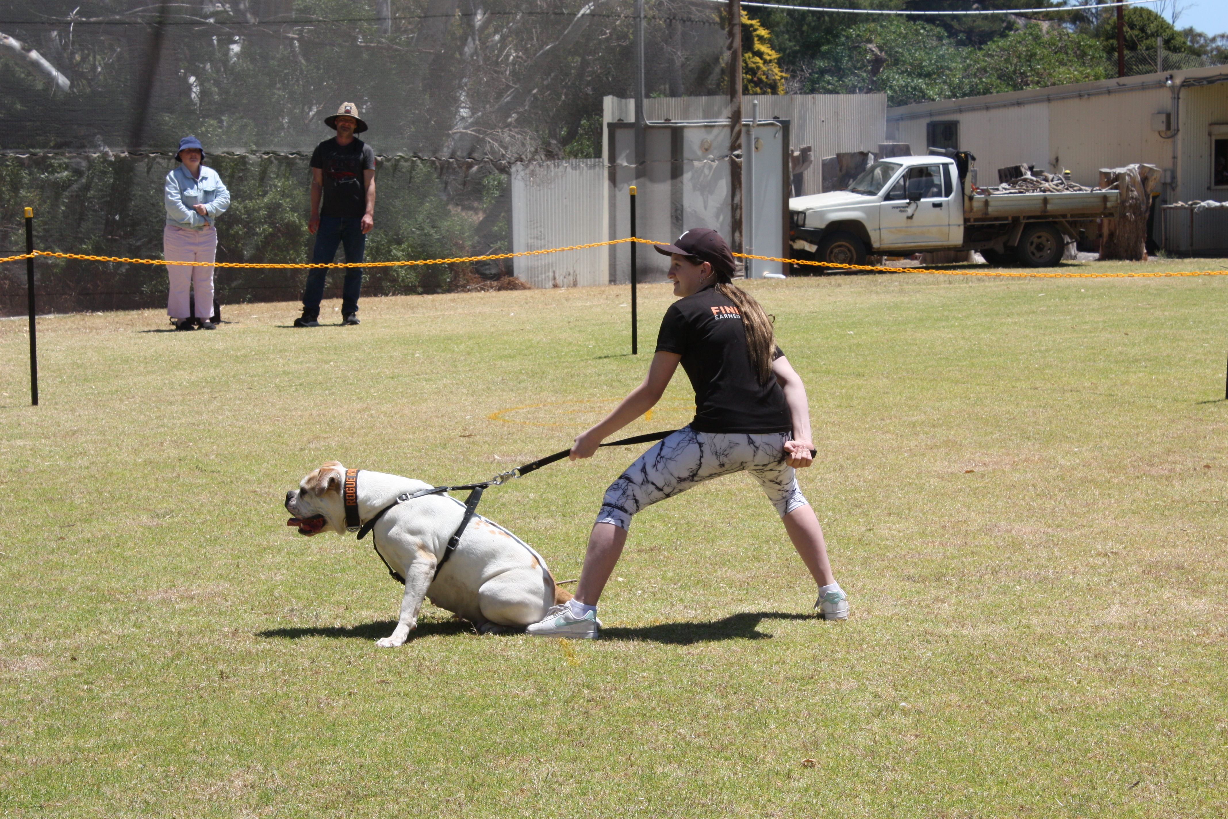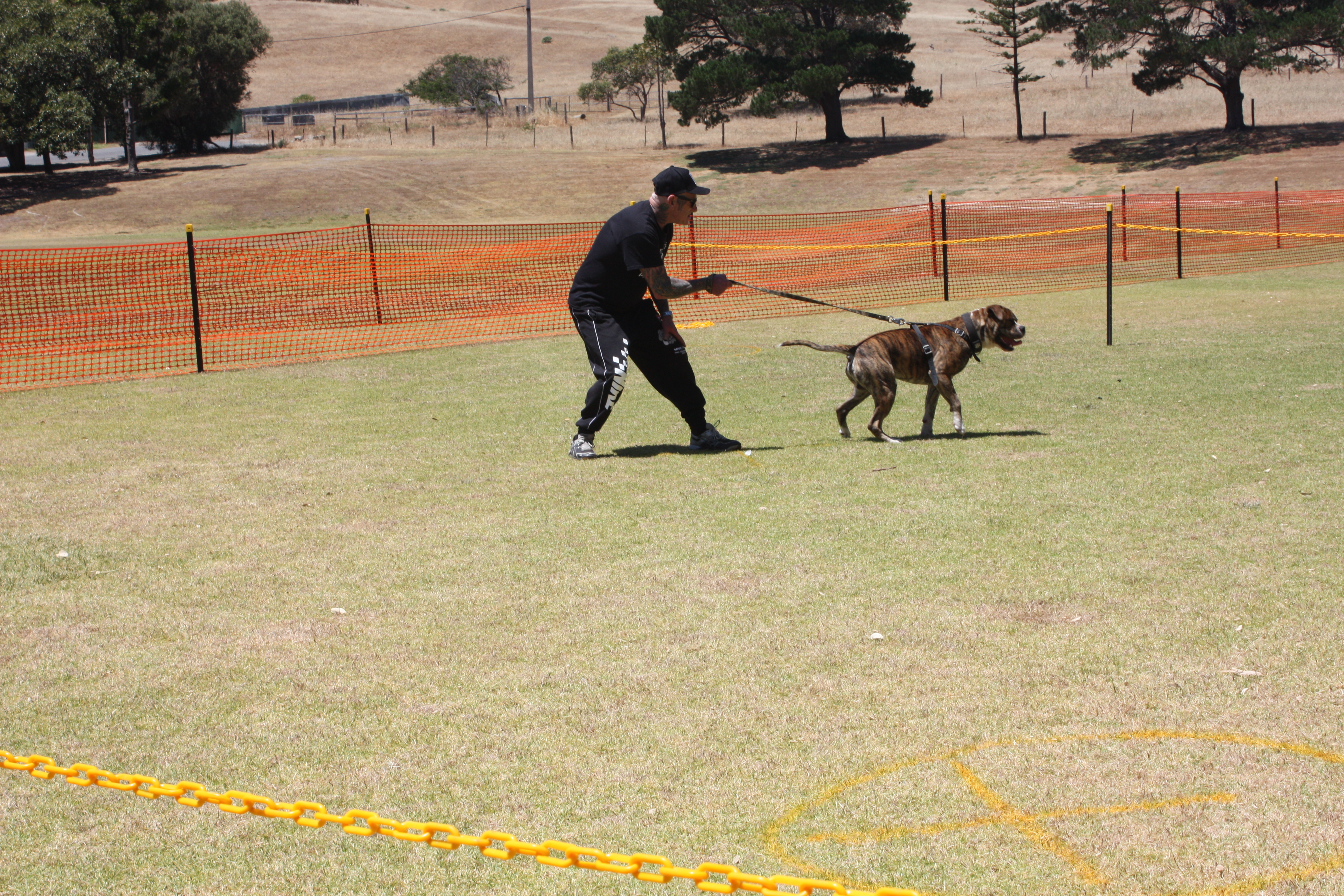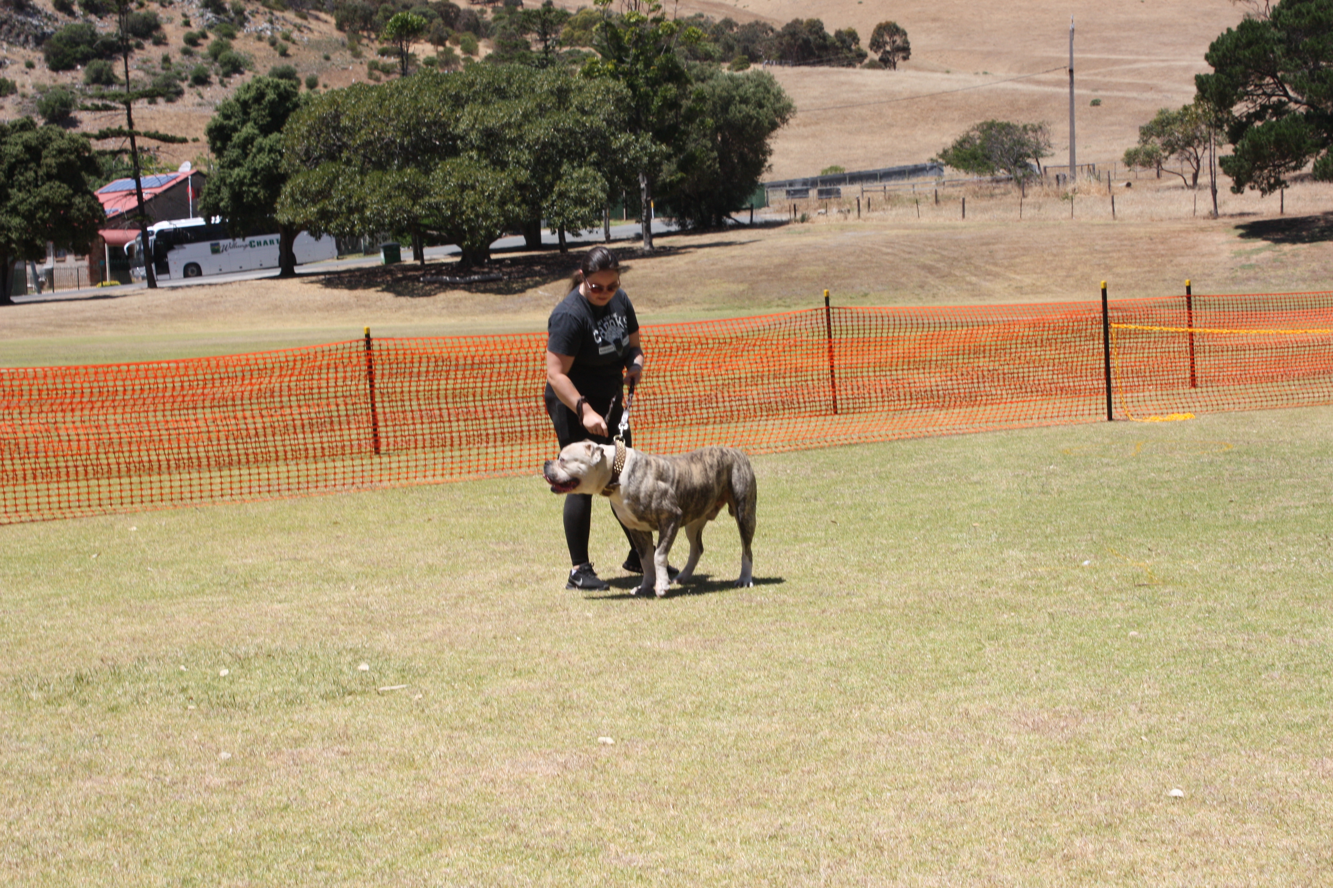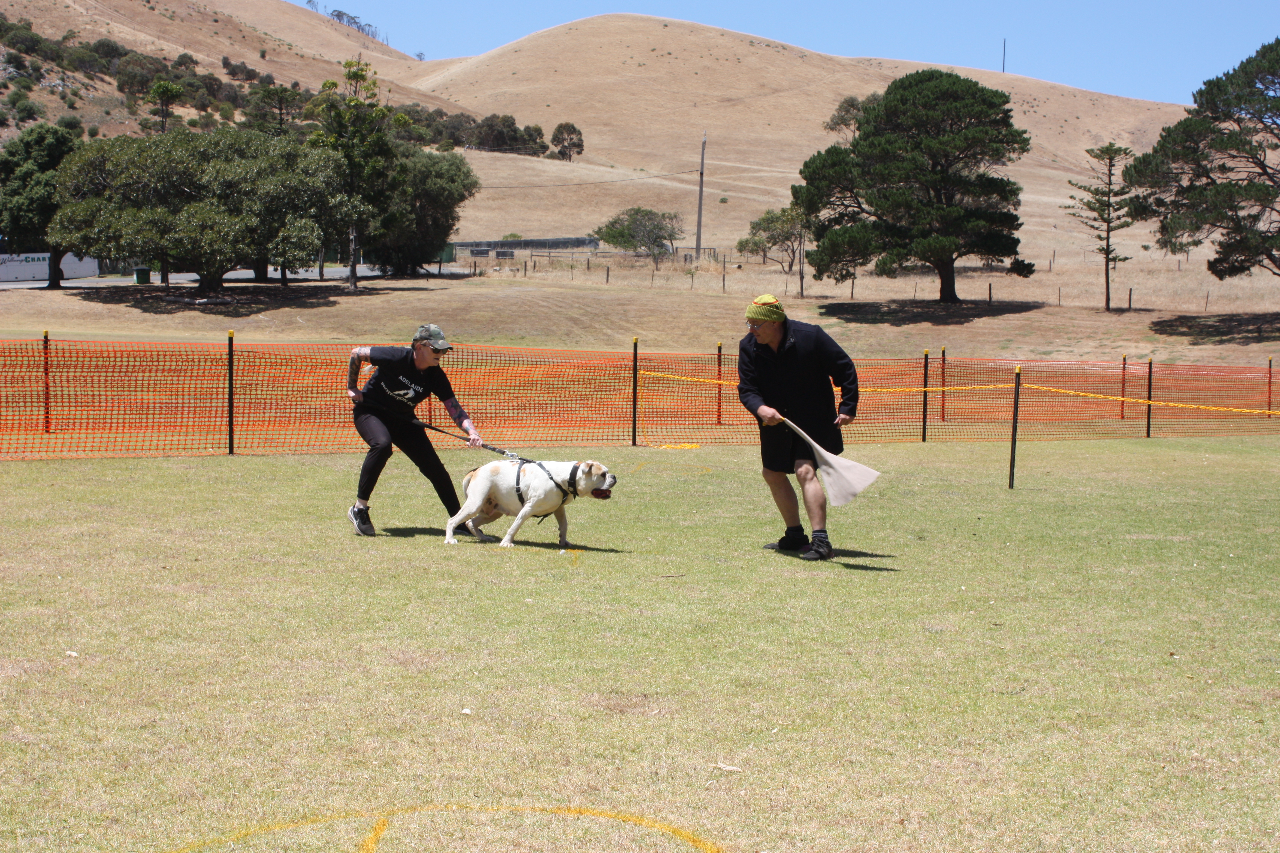One by one the competitors roll up and find their shady spot at the picturesque show grounds overlooking the beach. The local caravan park is dog friendly and great value, only minutes away from the show grounds. People have travelled from Queensland and Victoria for the Show as it gets bigger year by year. Six major Bulldog kennels were represented at the show including Excalibur from Tasmania with Fury @ Badlands. Around 45 people attended on the day. Nine Bulldogs competed across the 5 events, Courage Test, Sprint, Obedience, Exhibition, Long Run. We ran the Champion and Junior Champion Competitions and awarded The Bulldog Legends Trophy.