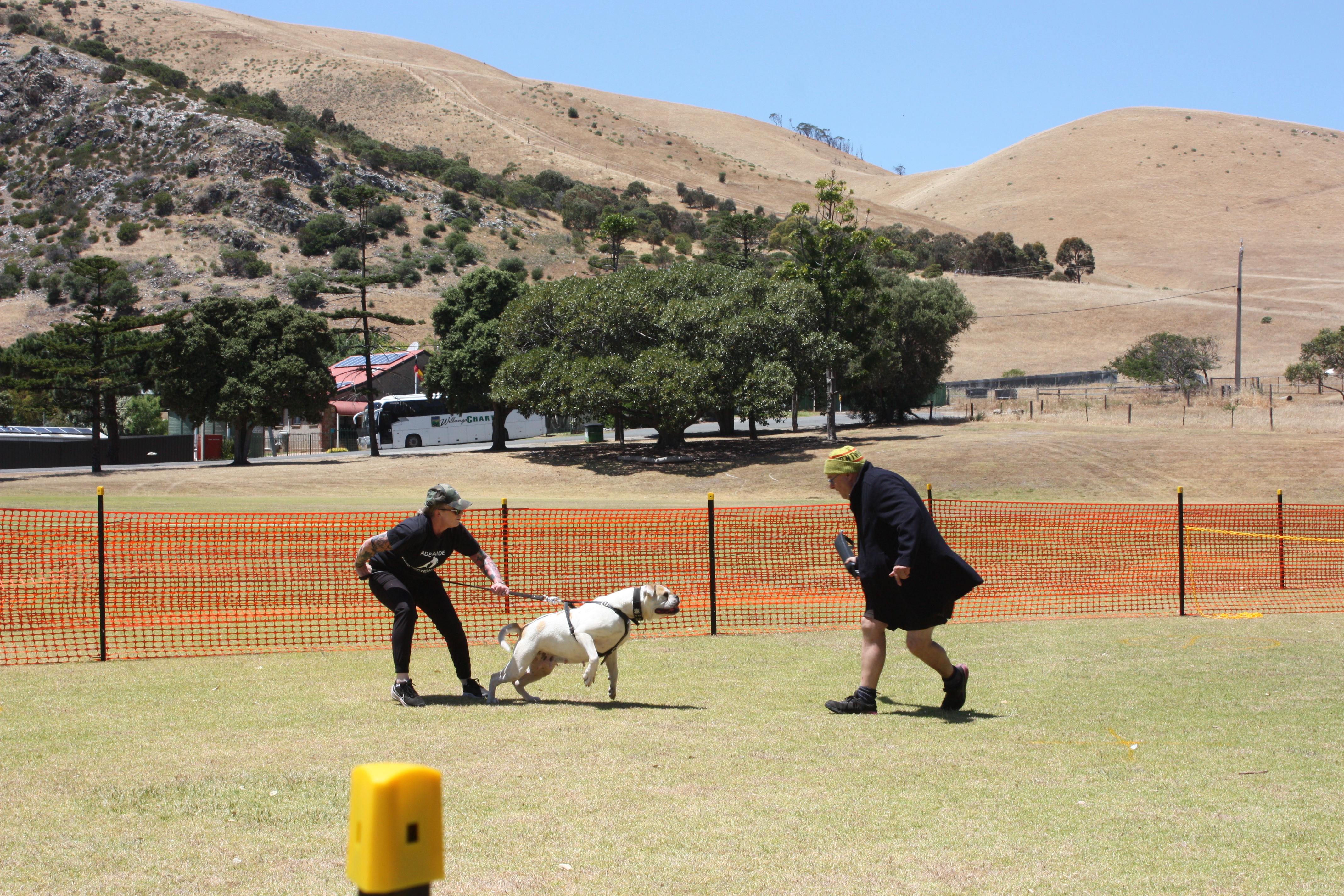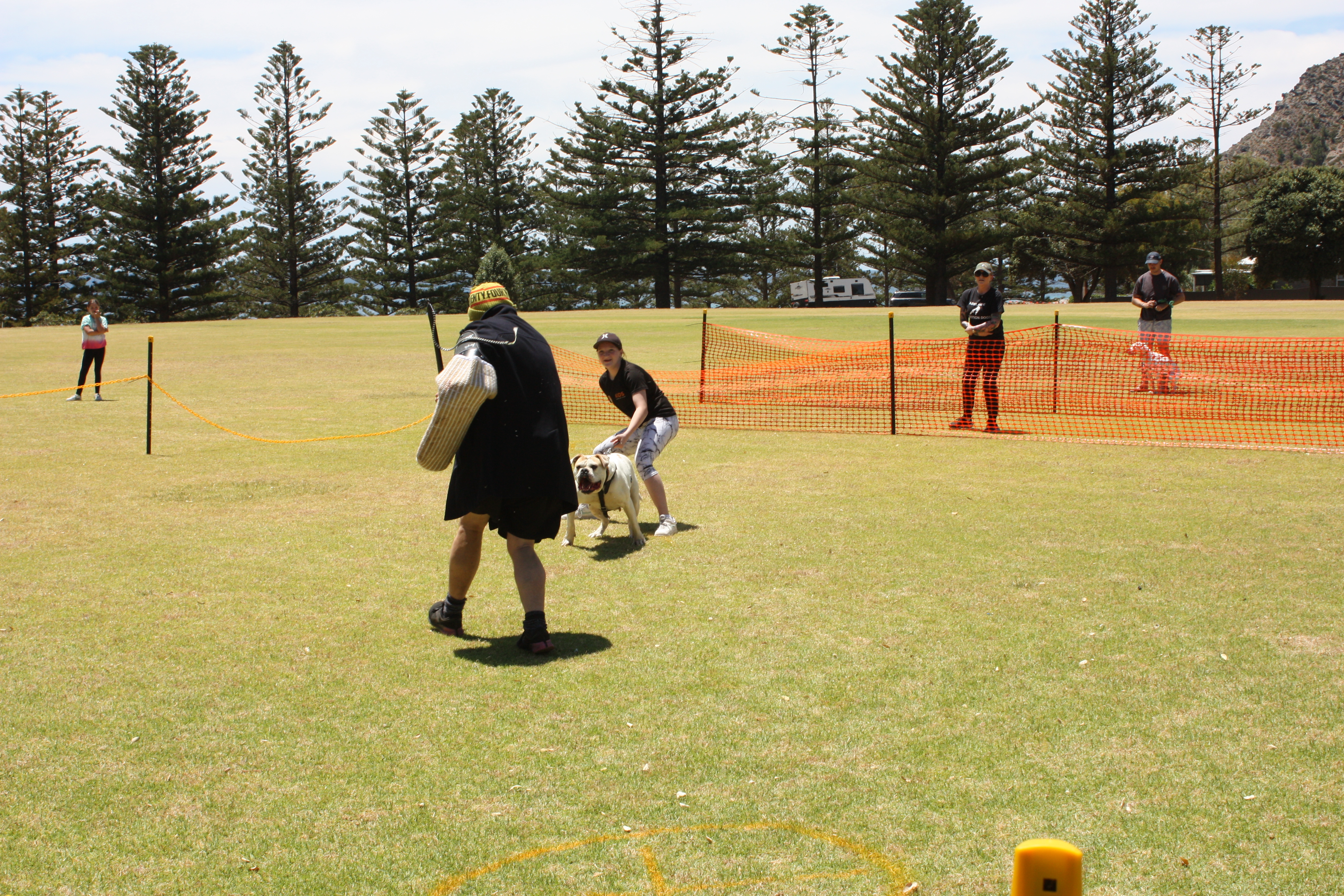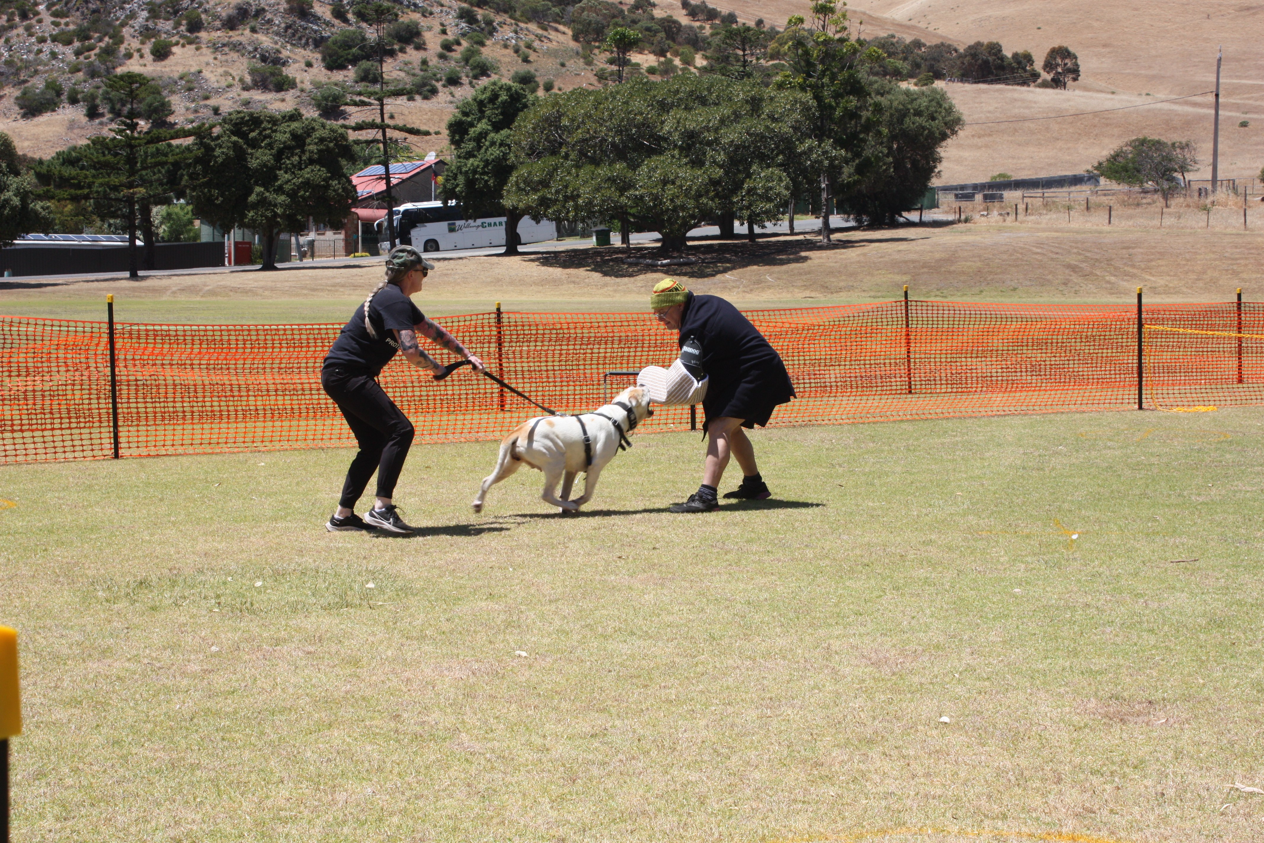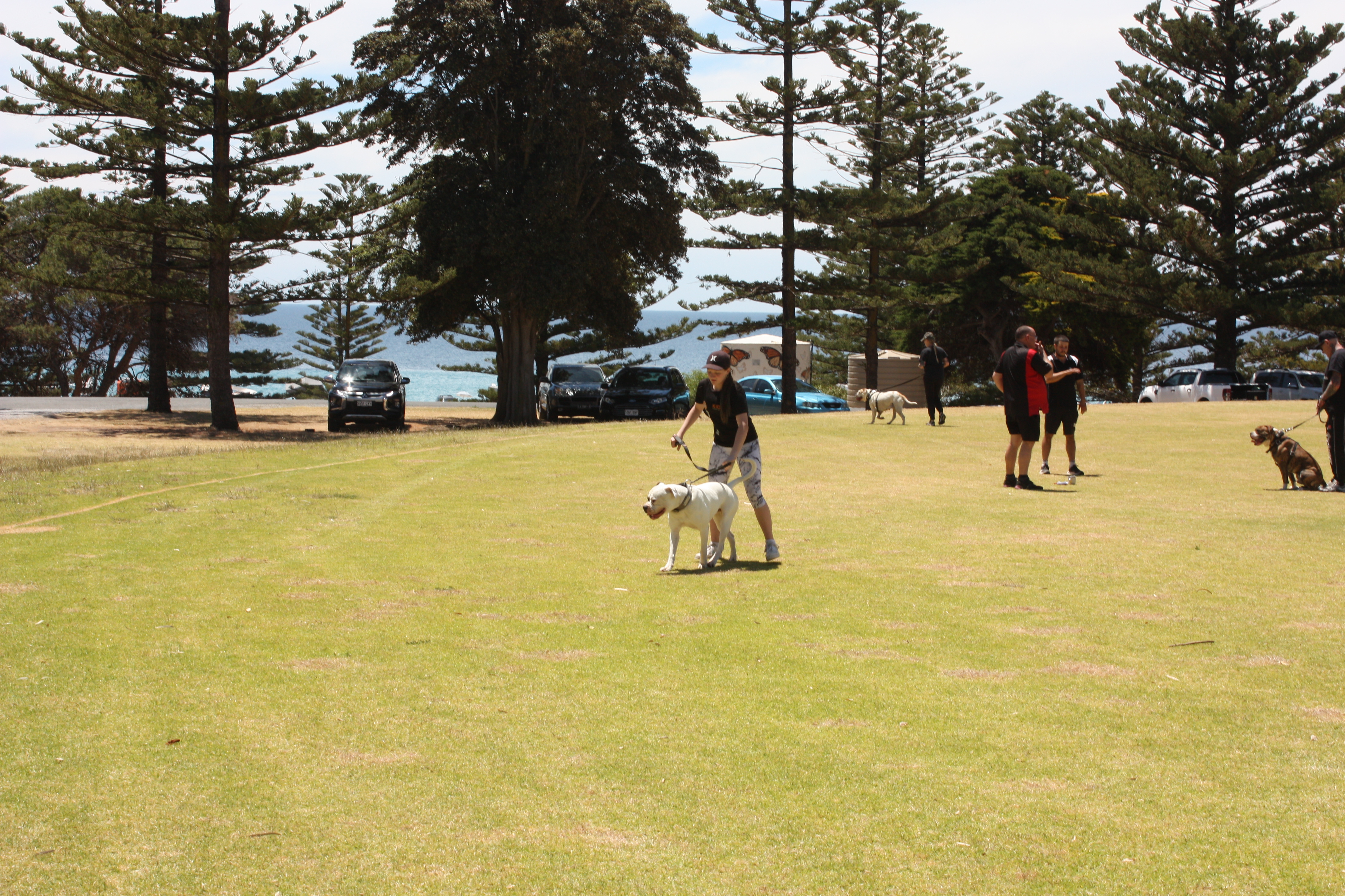 One by one the competitors roll up and find their shady spot at the picturesque show grounds overlooking the beach. The local caravan park is dog friendly and great value, only minutes away from the show grounds. People have travelled from Queensland and Victoria for the Show as it gets bigger year by year. Six major Bulldog kennels were represented at the show including Excalibur from Tasmania with Fury @ Badlands. Around 45 people attended on the day. Nine Bulldogs competed across the 5 events, Courage Test, Sprint, Obedience, Exhibition, Long Run. We ran the Champion and Junior Champion Competitions and awarded The Bulldog Legends Trophy.