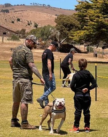 A ripper day with perfect conditions at a picturesque location - The Rapid Bay Cricket Club in South Australia saw an attendance of 30 people. We could have had as many as 20 Bulldogs and 40+ people if every one came who had booked in. But 30 was double that of the previous years inaugural event where only the faithful gathered in storm conditions. All 5 events were contested with 5 Bulldogs competing for the Championship. Nine Bulldogs competed in all, handled by 15 competitors. 25 prizes were awarded and as usual at Irondog Shows almost everyone went home a winner. A feature this year was the kids carrying their weight in the various events and prizes were awarded for best Junior Handler and best Junior Handlers (Hazel McGregor and The Family Key respectively with Dave Maxfields son getting 1st runner up). Below is David McGregor (Nitro Kennels) who hosted the Show for Irondog and also provided the equipment necessary to run the Courage Test not to mention the lovely lamb for the post show feast (free for all show competitors and members attending). He set out to raise the bar - and he did! What a fantastic day turning back the clock to the "good ol days". David also known as "Judge Dread" - living legend. Featured also is Bluey @ Keys Kennel who brought home some awards (a new acquisition of Keys Kennel) with a litter coming up! Thank you to Vanguard Kennels for producing our marvelous Show Poster.