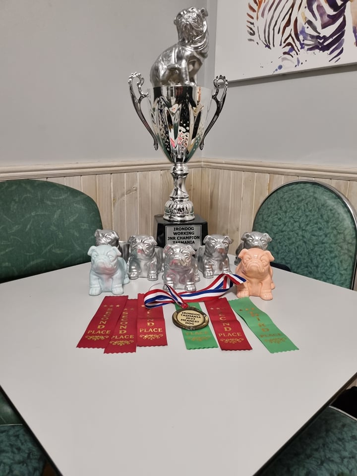 The great thing about an Irondog show is that although the champion must compete in all five events other Bulldogs and handlers can compete in individual events. So there is something for everyone with 25 Trophies, Medals, Corsages and Ribbons.